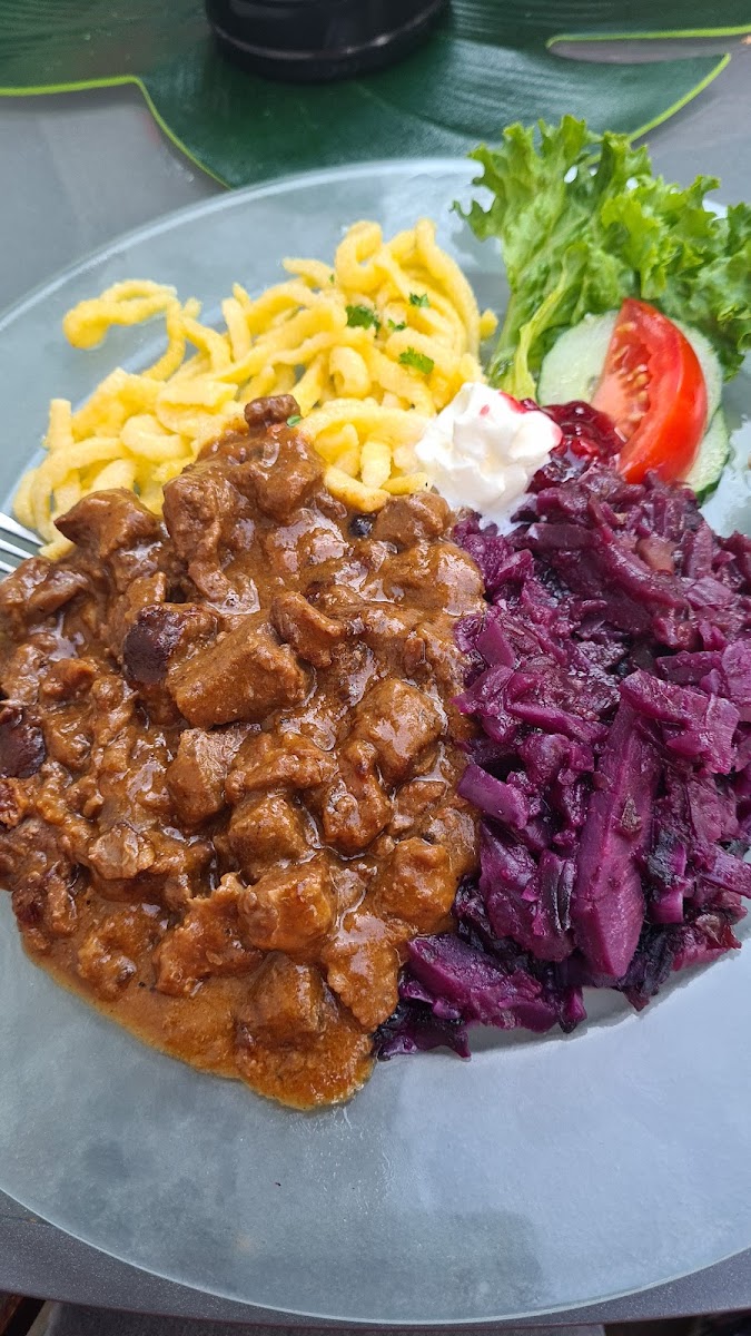 The food here is rooted in classic flavors, prepared in a way that feels honest and satisfying. One of the standout dishes is the pork steak served with crispy potato finger fries. It’s hearty, well-seasoned, and exactly what you want after a long walk around the lake. Another favorite on the menu is the Wildgulasch mit selber gemachten Spätzle und Rotkohl. The tender game meat, paired with homemade spätzle and sweet-sour red cabbage, delivers a deeply comforting experience that reflects regional cooking traditions.